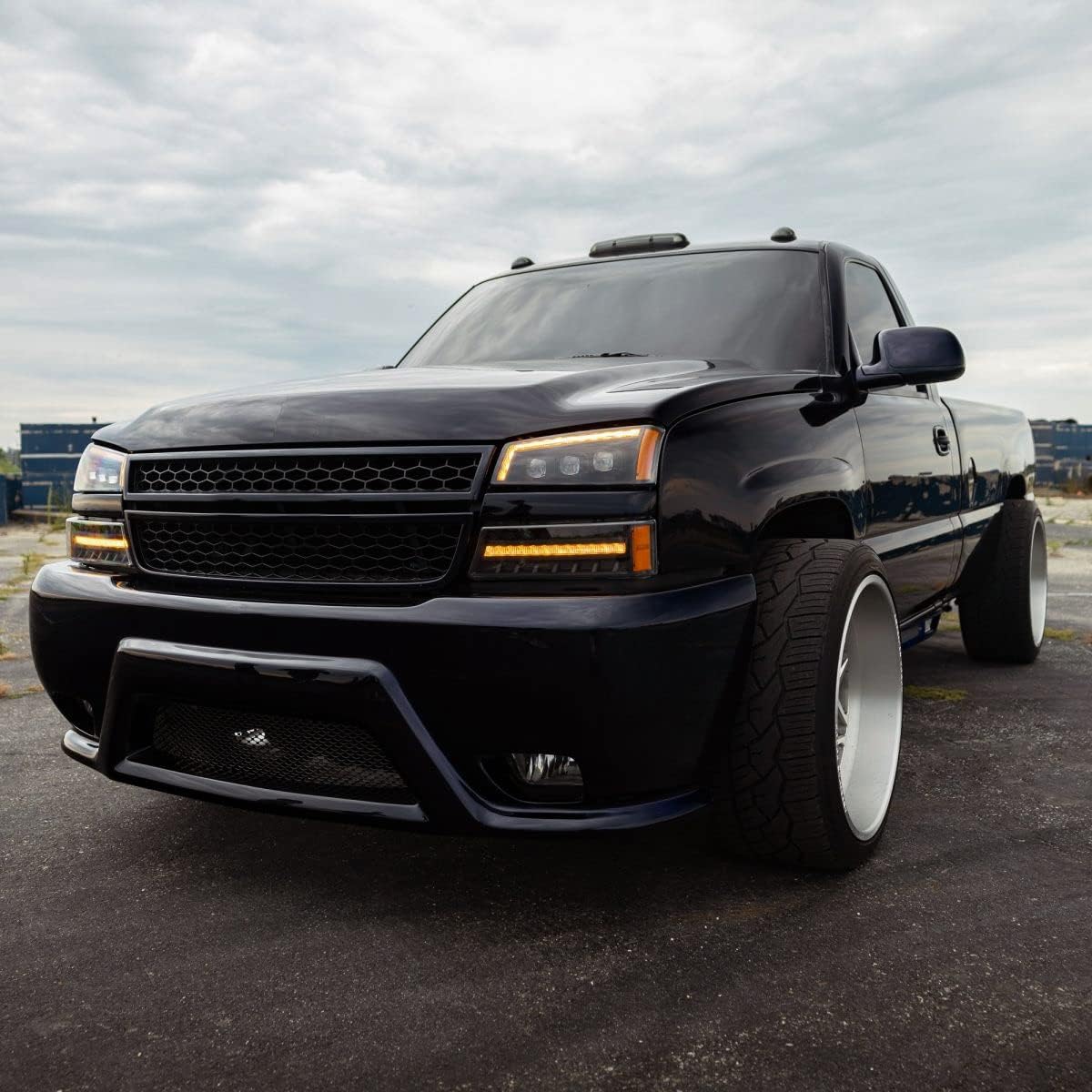 Fitment: Fits 03-06 Silverado 1500/2500HD/3500HD; 07 Silverado 1500/1500HD/2500 HD/3500 Classic body style only; 02-06 Avalanche without lower body cladding onlyLow Beam bulb size: Built-in LED High Beam bulb size: Built-in AlphaRex Luxx LED Color: Alpha-Black Feature: Switchback DRL/ Configurable DRL (White/Amber), sequential turn signal light, and the signature activation light feature, which is a sequential light show when you ignite your Silverado 100% brand new direct replacement as shown in the picture Alpha-Black housing aftermarket headlights Package comes with a pair of aftermarket headlights for driver and passenger sides, produces stronger and more focused light beam compared to most parabolic headlights Made by OEM approved manufacturer SAE/DOT approved Installation may require wiring and taking out the stock bumper. Professional installation is highly recommended