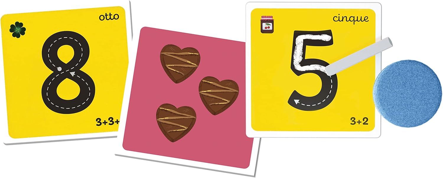An educational game by Sapientino that "has all the numbers" to entertain and learn the little ones in an easy and original way! Lots of nursery rhymes, tiles, minipuzzles and shaped elements to discover the numbers and quantities step by step and learn to count to 10. With the chalks and illustrated cards your child can learn to write numbers following the guidelines. With the game of bingo the fun doubles and you can challenge friends by familiarizing yourself with the additions and shapes of the shaped elements. A truly complete collection of games with lots of different activities to bring your child closer to math in an easy and natural way through play. With the game material you will learn to write numbers 1 to 10 correctly, associate numbers and quantities, train to count the elements, understand the mechanism of additions and learn to recognize the different shapes of objects. A Sapientino educational game recommended for children from 4 years old. Made in Italy.