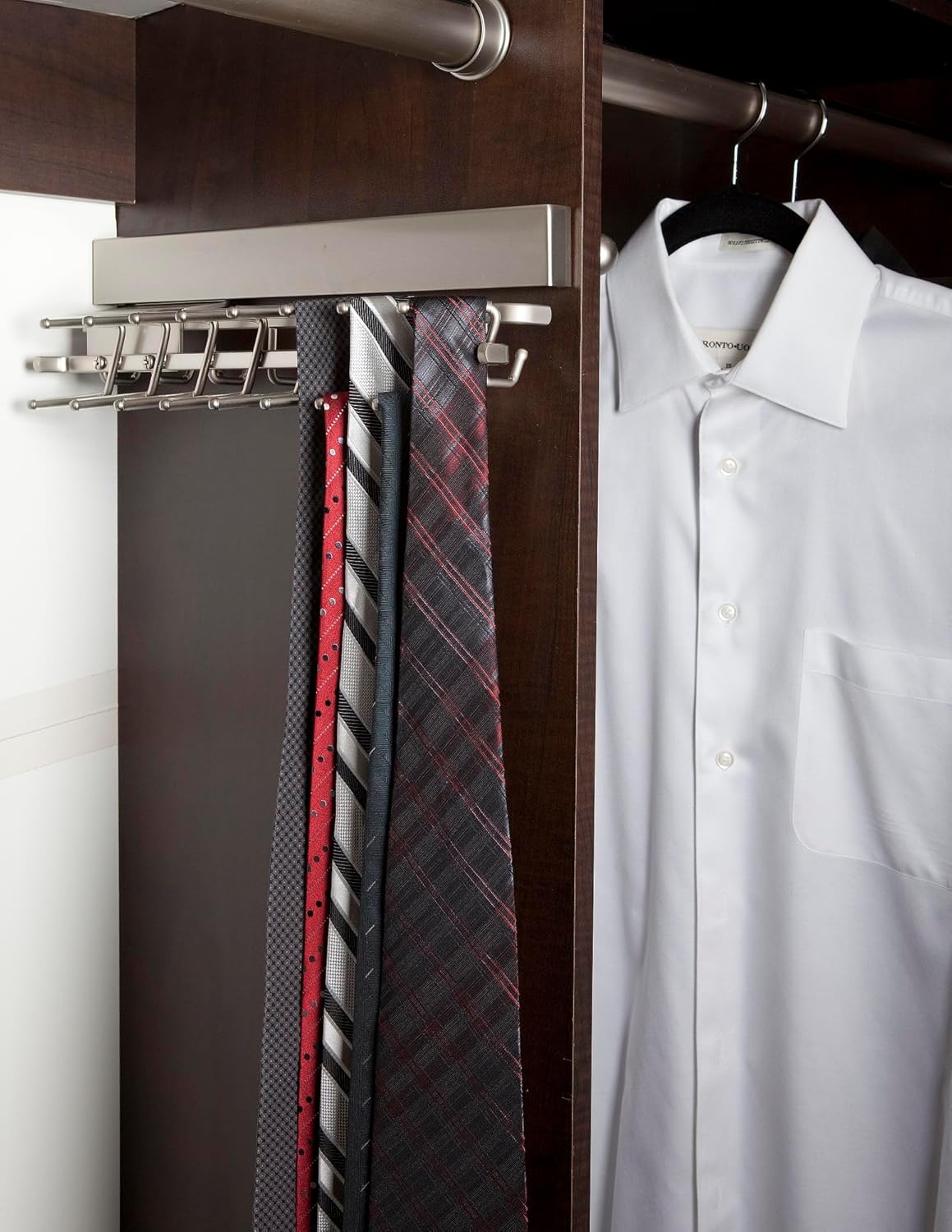 Offering easy to reach storage for your ties, the Deluxe Tie Rack complements our other deluxe accessories for storage of belts, scarves, and more. It stores against a closet panel and then slides out when needed from behind clothes on full-extension, ball-bearing, steel slides. See your collection of ties on this elegant rack featuring 16 non-slip hanger arms on a steel frame. It is available for 14" or greater depth panels in several luxurious finishes to match other Sidelines By Rev-A-Shelf accessories.