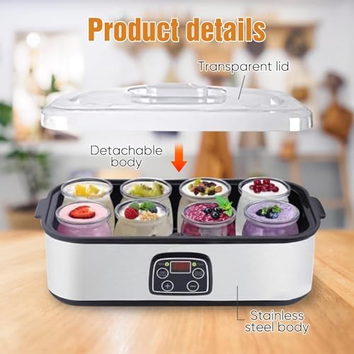 Create delicious homemade yogurt effortlessly with our electric yogurt maker. Simply pour your milk and culture medium into the included jar, fill it with warm water, place it in the machine, and set the timer and temperature for 8-12 hours. After that, chill in the refrigerator for a few hours before enjoying. This yogurt maker features a user-friendly digital screen and an auto-off function, ensuring precise results every time without any guesswork. With a generous 1400ml capacity, it comes equipped with 60 convenient 8-ounce glasses and operates within a temperature range of 20 - 55°C. Its powerful battery lasts up to 48 hours, allowing you to produce trillions of active strains at home without the high cost associated with store-bought options. Transform your meals with your homemade yogurt; you may never want to buy it again. Specifications: - Name: Electric yogurt machine - Material: plastic construction - Color: Gray - Power: 25W - Temperature control range: 68°F to 131°F - Run time: Up to 48 hours - Functions: Ice cream, rice wine, breakfast set - Size: 36*14*19cm / 14.04" x 5.46" x 7.41" - Weight: 2.4kg - Condition: New - Unit Count: 1 - Standard Product ID: 1 - Feed ID: 1 Package includes: - 1 yogurt maker - 8 glass jars Notice: - Due to variations in lighting and screen settings, the actual color of the item may differ slightly from the images. - Please allow 0.5-2cm differences in size due to manual measurement.