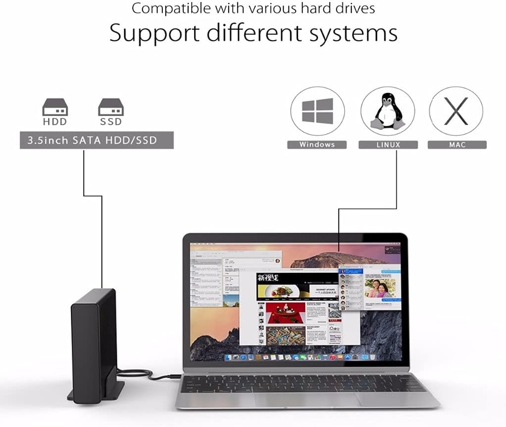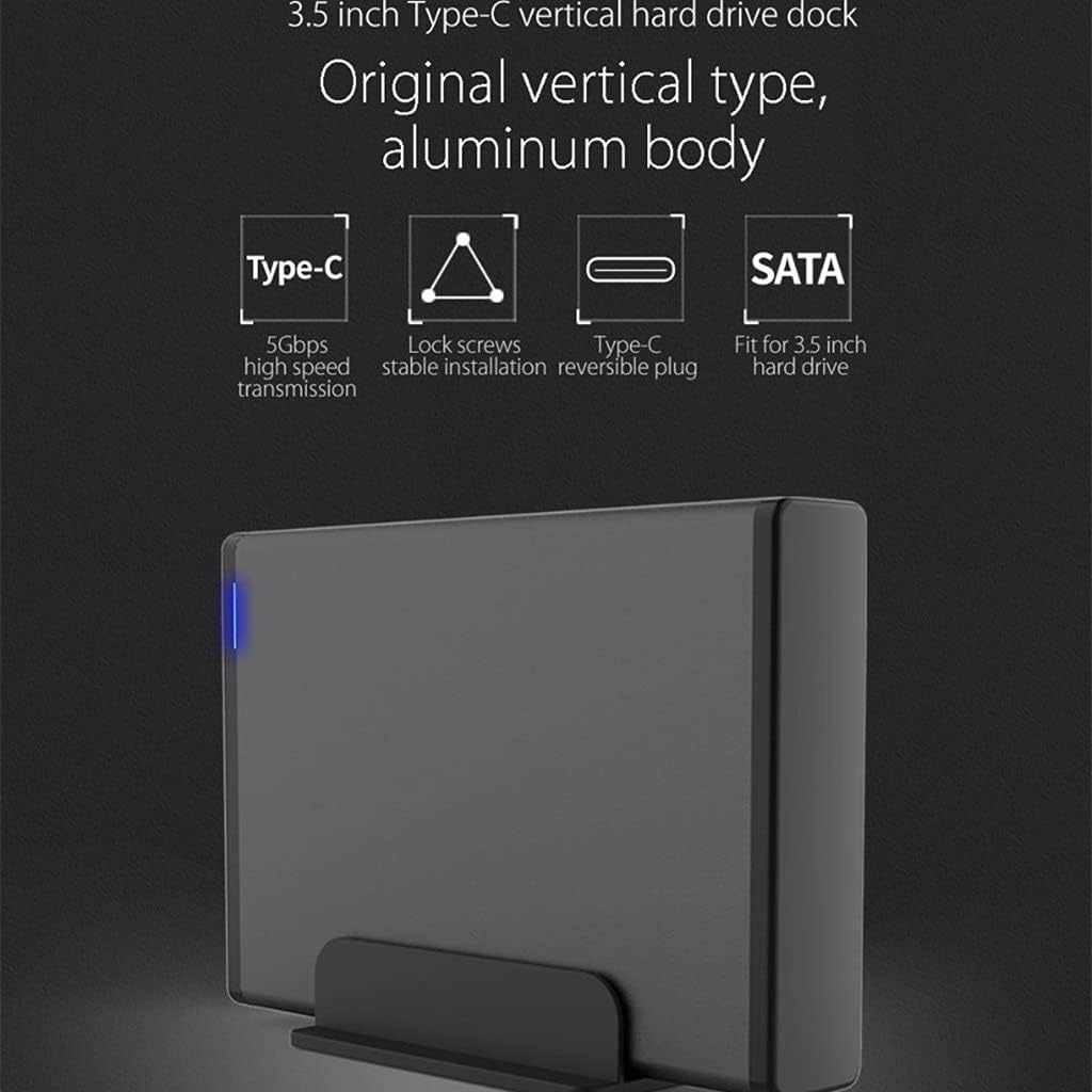 This type-C hard drive enclosure adopts lock screws stable installation to keep it stable vertical design to save space of desk; Support 3.5 inch HDD/SSD and the capacity up to 8TB. High-speed interface with UASP Transfer Protocol, supporting maximum 5Gbps data transfer rate, faster than traditional USB 2.0. Creative soft LED light monitors working situation clearly. Suitable for most major systems in the market including Window, Mac OS and Linux. Strong power supply can be easy to meet the needs of the hard drive power supply up to 24W. Aluminum alloy and ABS material to improve heat dissipation and prevent static. Creative vertical design make the hard drive enclosure to make the desk more clean and tidy. Support 8TB massive expansion, store as you wish, farewellto small capacity. Abundant and stable power supply Equips with strong external power supply system to meet power dissipation requirement of SATA HDD and SSD and keeps them efficient performance. Case Material: Aluminum Size: 3.5" Power Adapter: 12V2A Package list: 1x HDD Docking Station