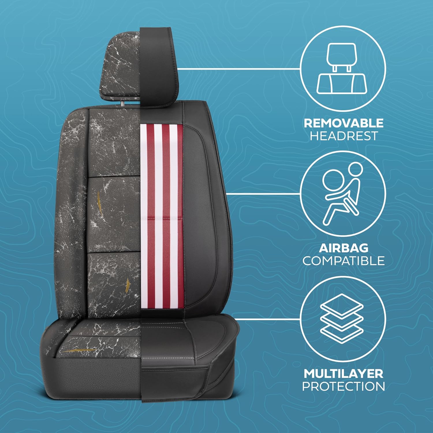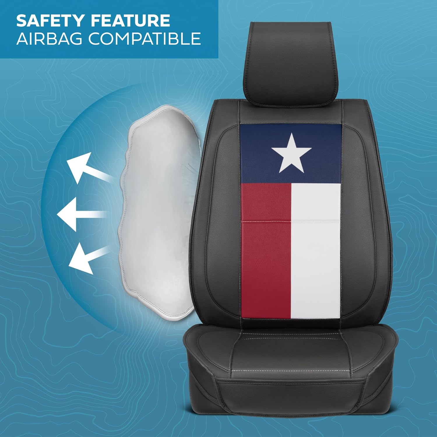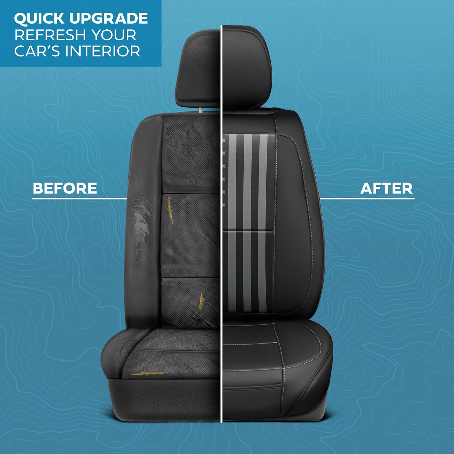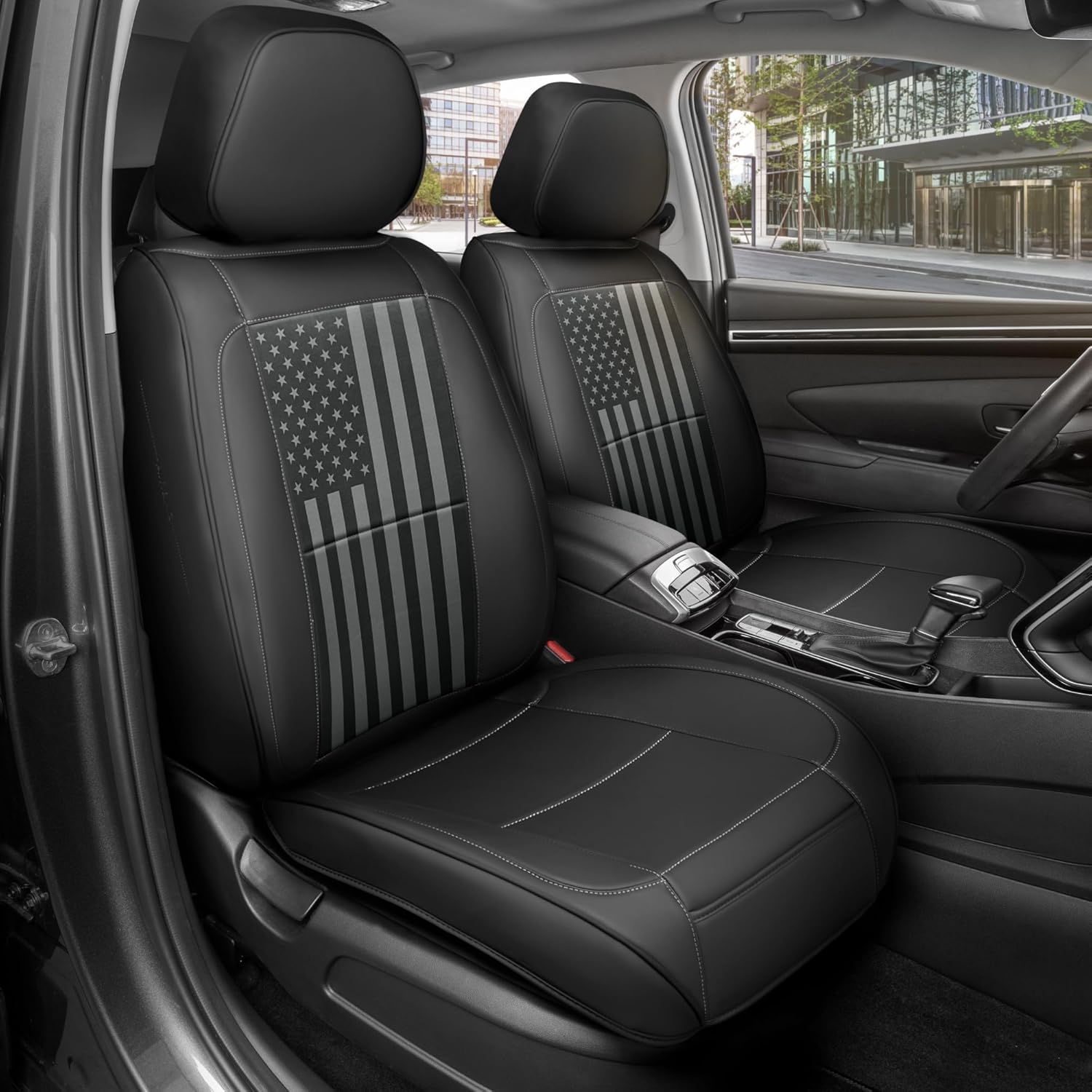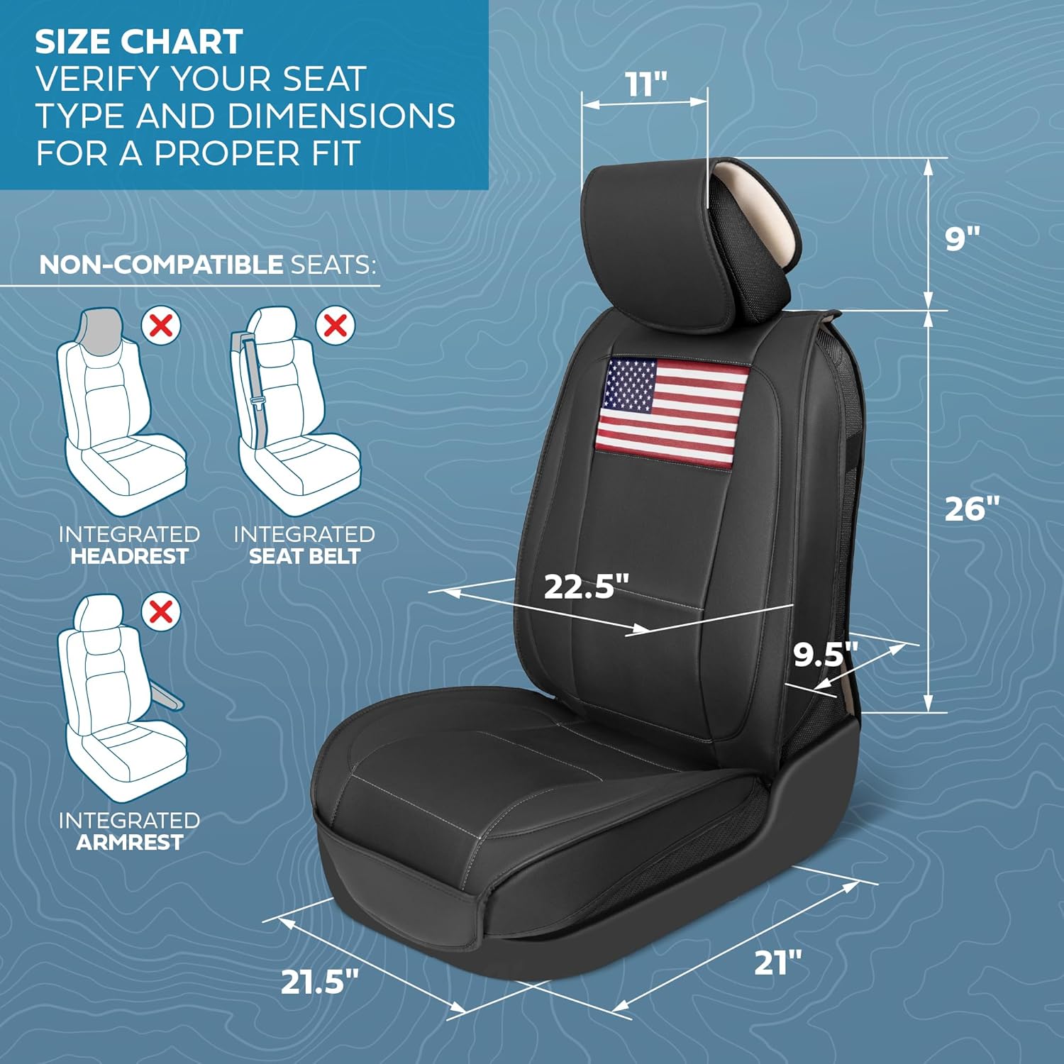 MotorBox Patriotic American Flag Napa Leather Car Seat Covers:Our Updated MotoBox Premium Napa Leather Car & Truck Seat Covers combines premium quality, unmatched craftsmanship, and patriotic pride to enhance your vehicle’s interior. These automotive seat covers are meticulously crafted from the finest Napa leather, renowned for its luxurious feel and exceptional durability. The combination of genuine Napa leather and faux leather provides a sleek, stylish, and long-lasting upgrade for your car, truck, or SUV. Featuring a stunning American Flag design, these seat covers reflect your love for the USA, making them a perfect choice for Memorial Day, 4th of July, or any time you want to show your patriotism. The intricate stitching and precise design bring out the bold colors of the American Flag while offering a sophisticated touch to your car's interior.The MotorBox seat covers are designed for comfort and support, making long drives more enjoyable. The soft Napa leather ensures a plush, premium seating experience, while the covers’ snug fit guarantees they stay in place, offering both stability and style. Compatible with cars with heated leather seats and extremely easy to install, these seat covers are tailored to fit most car models, including trucks, SUVs, and cars. Simply slip them over your seats, secure the straps, and instantly elevate your vehicle’s appearance.Beyond aesthetics, these seat covers are also highly practical. They provide ultimate protection against spills, stains, dirt, and wear, preserving your seats and extending the lifespan of your car’s interior. Whether you're a busy professional, a road trip enthusiast, someone who loves a touch of elegance, or just want to show off your American Pride, MotorBox's Luxurious Stars and Stripes American Flag Napa Leather Car Seat Covers offer the perfect blend of comfort, style, and durability.