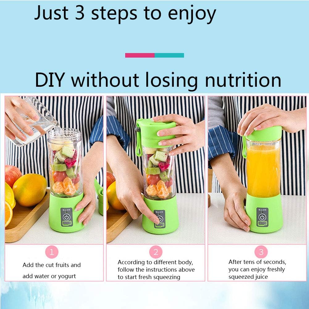 Product name: Portable electric juicerProduct color: green, purple, pink, blueBattery voltage: 3.7V/7.4VProduct capacity: 380MLBody material: plasticFunction: JuicingSmart type: Smart is not supportedOne-time maximum juice output: 400mL and belowCapacity of pulp box: below 500ml (including 500ml)Feeding port shape: roundMaximum speed of juicer: 20001 rpm (inclusive)-22000 rpm (inclusive)One-time maximum oil output: 400mL and belowCup body material: food grade PP (not fragile, non-toxic)Specifications: 2-page blade, 4-page blade, 6-page bladeProduct size: length 80mm* width 80mm* height 237mmPacking list: color box, data cable, manual