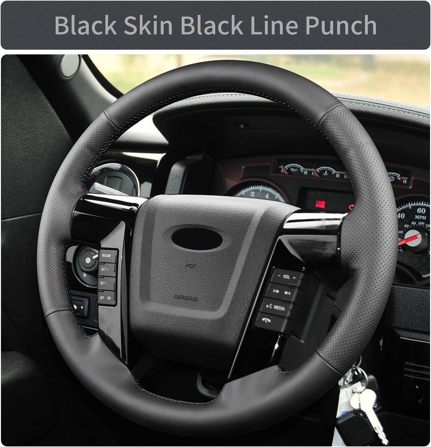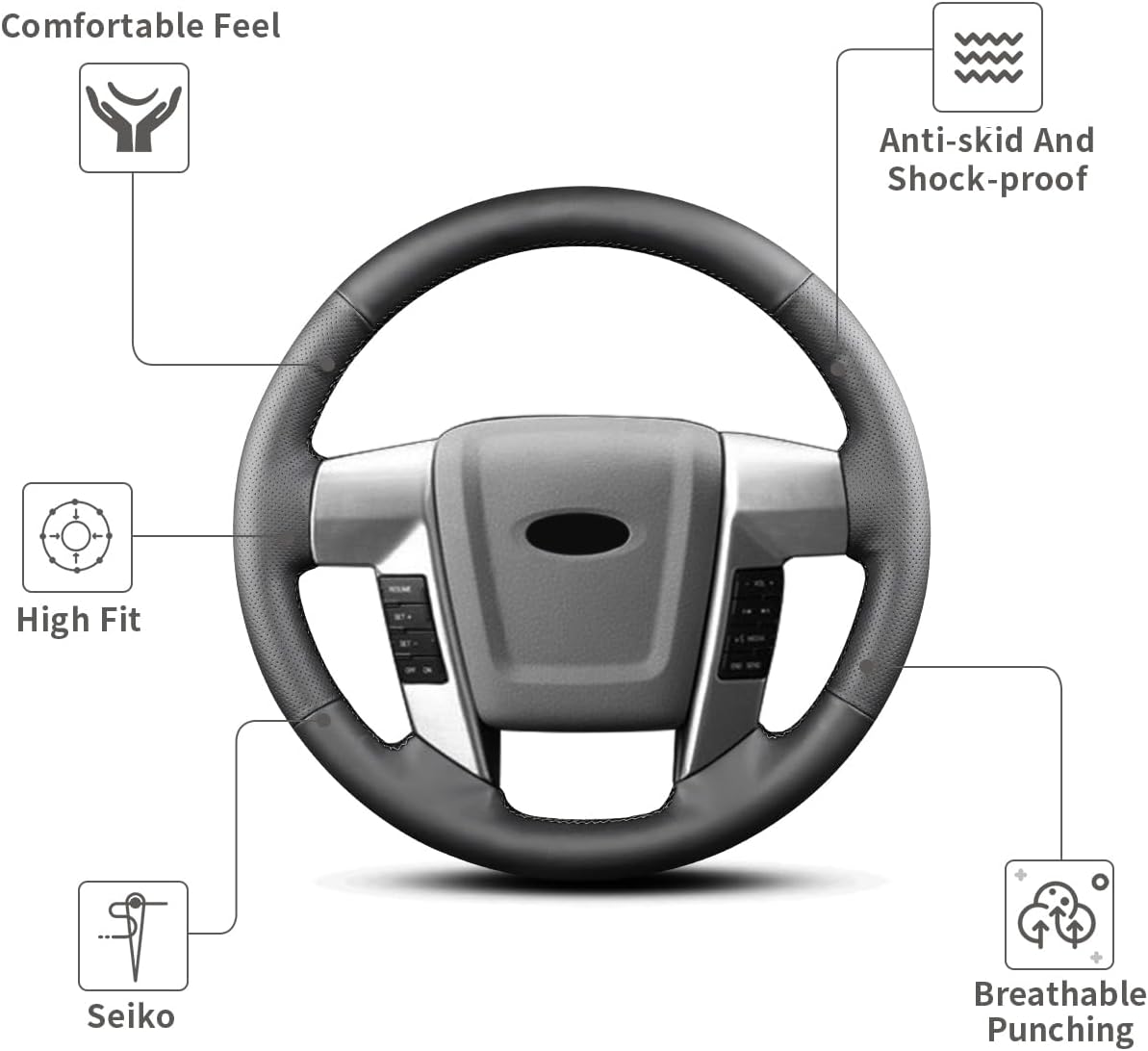 Yeolpise Hand Sewn Steering Wheel Cover Non-Slip Breathable Microfiber Leather Steering Wheel Cover wrap Car Interior Accessories,make every detail of the steering wheel be perfectly wrapped, just like the original factory. Features: 1. Perfectly fit the OEM steering wheel,make every detail of the steering wheel be perfectly wrapped. 2. Made of high-quality microfiber leather, non-slip, breathable and comfortable grip. Give your old steering wheel a new look. 3. Hand Sewing,It takes about 2-3 hours to sew by hand. There is no need to remove the steering wheel, stitching is done directly on the original steering wheel. Applicable Models: Replacement for Ford 2015 Expedition/2014 F-150 Tremor/2013 F-150/2010 2011 F-150 Harley-Davidson/2009 F-150 Platinum/ 2009 F-150 FX4. Operation Steps: 1. Put on the steering wheel cover. Make sure the location is correct. In order to ensure that the stitching at the back is not crooked, the position where the leather meets is exactly at the center seam on the original steering wheel. 2. Affix double-sided tape to fix it. You can stick double-sided tape on the stitching on the inside of the leather. Be careful not to stick the double-sided tape on the edge, otherwise the edge may not fit into the gap. 3. Plug the edge. After positioning and sticking the double-sided tape, use the edge plug device to plug the exposed edge into the gap of the steering wheel, and pay attention to use different angles to plug the edge. 4. Hand stitching. Select a line that is 3-5 times the length of the sewing area, and then you can choose a starting point to stitch.