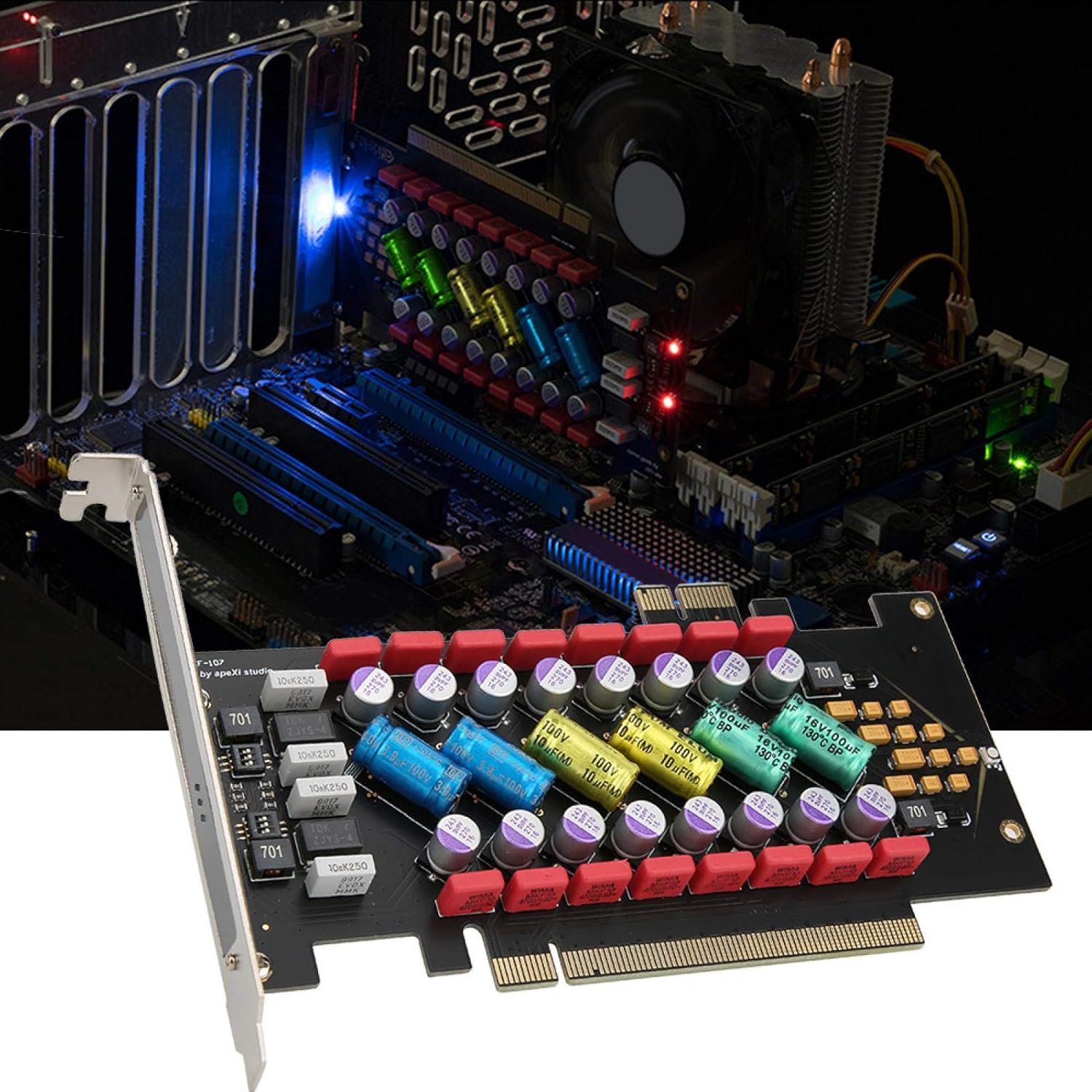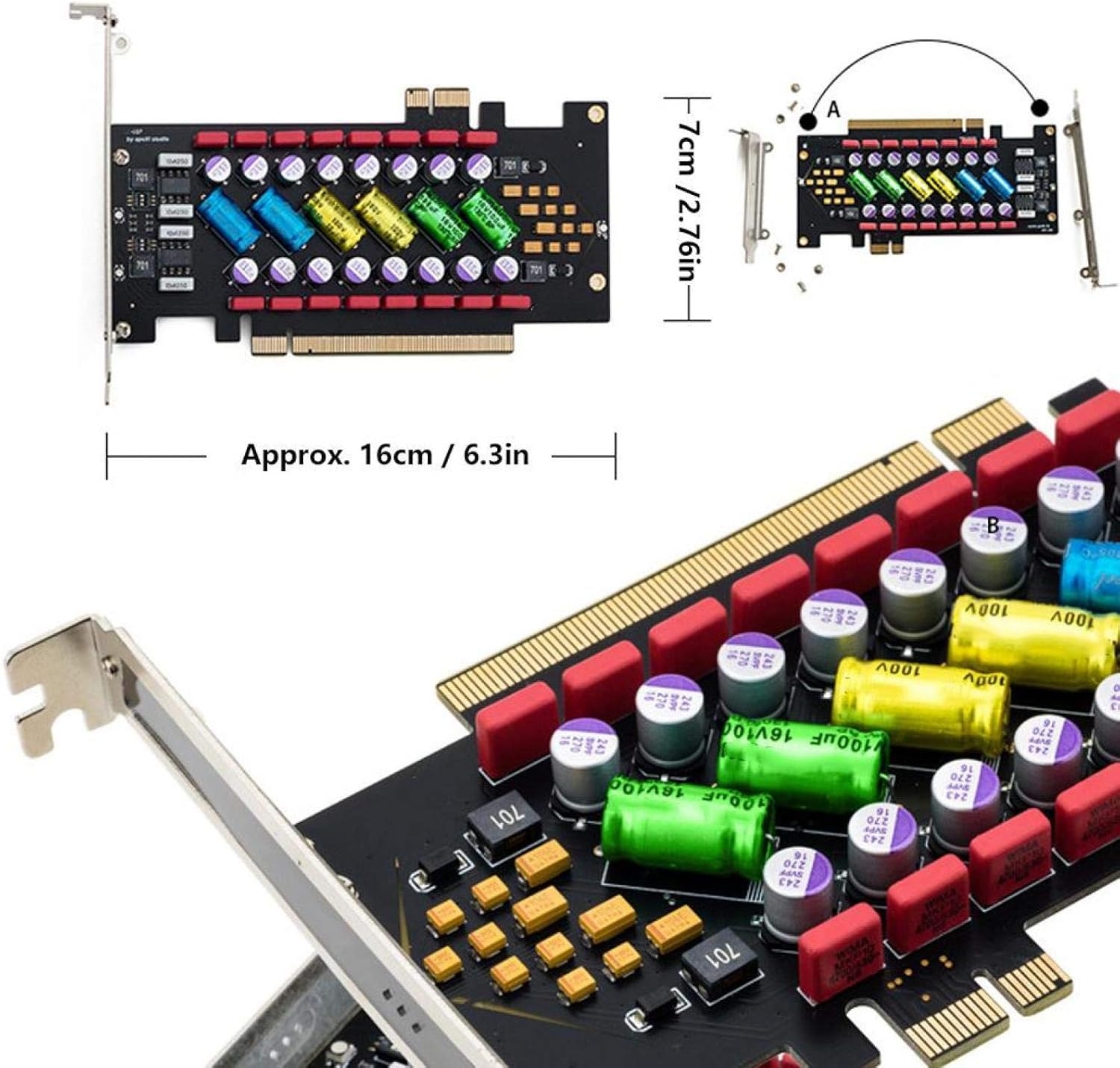 Feature: 1. To make up for the sound card due to the use of PC switching power supply defects. Because that PC power supply has always been a shortcoming and disadvantage of PC Hi-Fi. Specification:Item Type: Power filter card Product Element Shape: Rainbow Candy Motherboard Size: Approx. 16 x 7cm / 6.3 x 2.76in Uses: Used for PC power purification filter New Colorful LEDs: Two groups of LEDs can independently control the color, with 7 different RGB colors, or you can choose to turn off the LEDs. Product Manual: The PC HI-FI power filter card can effectively improve the output quality of the sound card, mainly used for power supply filtering, isolating the ripple interference and high-frequency noise caused by high-power devices (such as graphics cards) to the PC Hi-Fi system. And it can make up for the defects caused by the use of PC switching power supply for the sound card. Compatible: PCI Express 1X / 2X / 4X / 8X / 16X interface and PCI Express1.0 / 2.0 / 3.0 standard. PCI-E 1X Compatible: PCI-E 8X / 4X / 2X slot. Package List:1 x Audio Filter Module2 x Screw2 x Rubber Washer