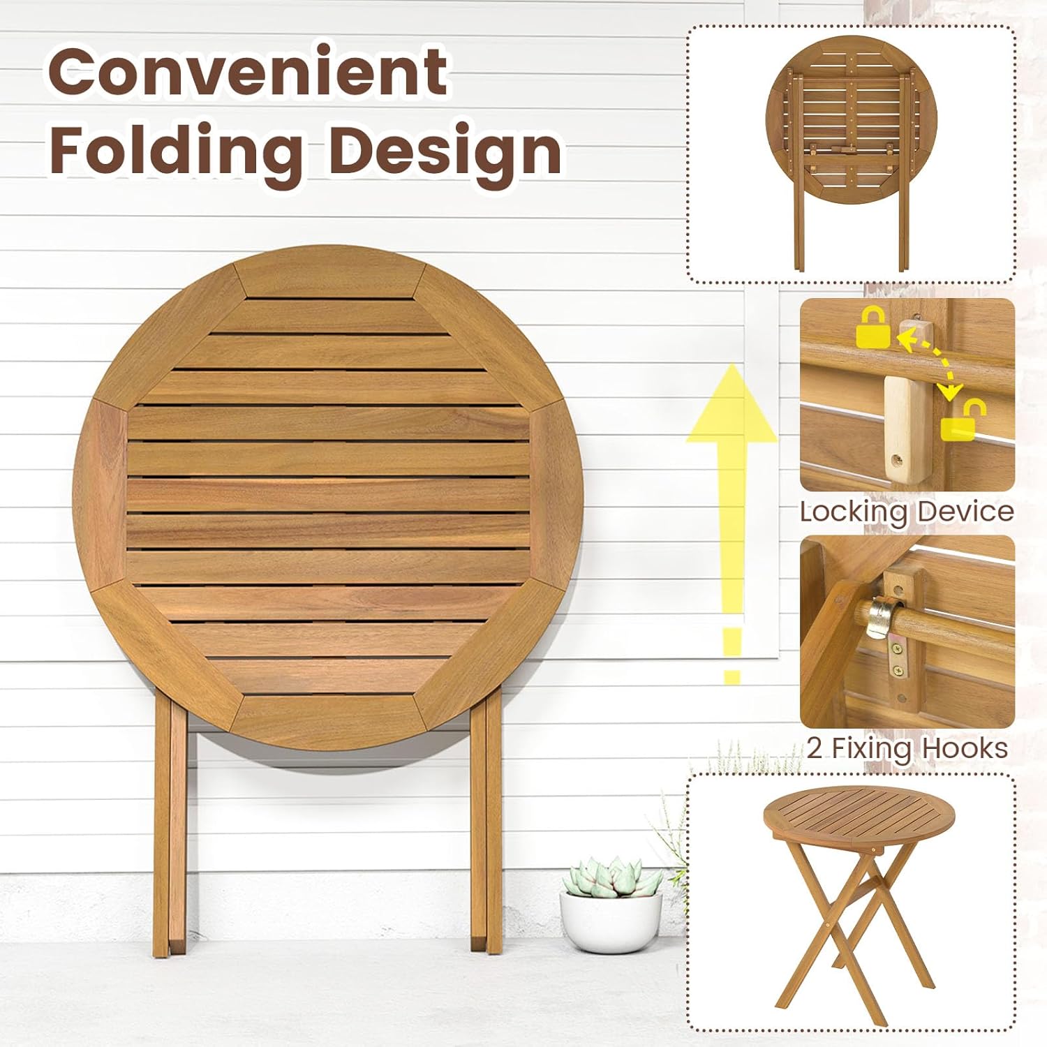 Description: Elevate your outdoor dining experience with this exquisite folding patio table, ideal for backyard, garden, deck, balcony, sunroom, porch, or poolside. Featuring a high-strength, splinter-free construction with a slatted tabletop that highlights the natural wood grain, this outdoor bistro table perfectly combines elegance and durability. The easy fold mechanism, complete with a locking device and hooks, allows for space-saving storage. Moreover, the patio foldable table is DIY painting available to fit different decorations. Perfect for intimate outdoor meals, this portable wood table with well-made details is not only a practical addition but also a stylish one. Note: Please regularly oil (not included) the wood surface for maintenance Features: Quick-folding design for effortless storage and transportation Made of solid acacia wood for strong support Slatted tabletop keeps all your drinks, snacks and other essentials within reach X-shaped design and crossbar for higher stability Bring natural elegance with appealing wood grain DIY painting available to suit for multiple decorations Ideal for backyard, front porch, backyard, lawn, poolside, deck and so on Only need to install the tabletop onto the legs, saving time and effort Please avoid rain exposure for prolonged serving time Specifications: Color: Natural Material: Acacia Wood Unfolded Product Dimensions: 26” x 27” (Dia x H) Folded Product Dimensions: 26” x 2.5” x 37.5” (L x W x H) Weight Capacity: 180 lbs Net Weight: 12 lbs Package Includes: 1 x Round Patio Folding Table 1 x Instruction