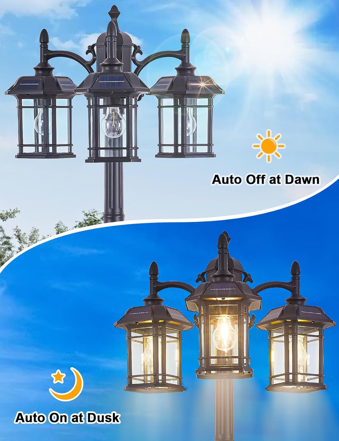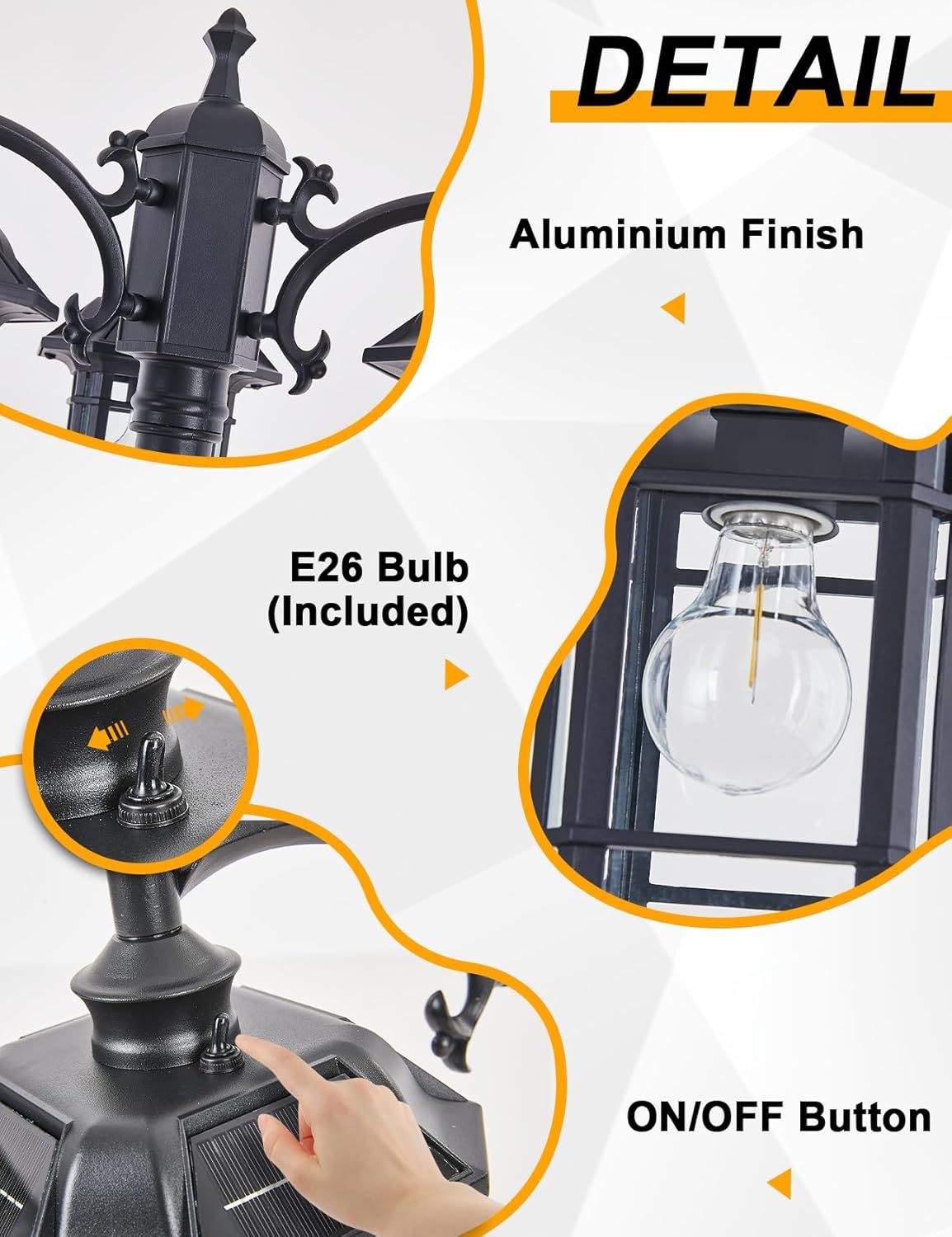 | Included Components | 3-Headed Solar post lights (included Bulb), Column, Post base, Install accessory kit, mounting bracket card, Detailed installation instructions |